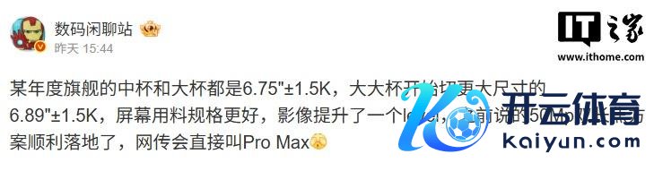 据爆料,该机的圭臬版和 Pro 版均搭载 6.75 英寸 1.5K 屏幕,“大大杯”初始切更大尺寸的 6.89 英寸 1.5K,屏幕用料规格更好,影像提高了一个等第,之前说的 50Mp 双长焦决策成功落地了,网传会径直叫 Pro Max。
