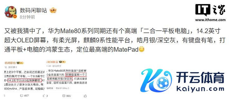IT之家 11 月 15 日音信,博主 @数码谈天站 本日爆料称, Mate80 系列同时还有个高端「二合一平板电脑」,14.2 英寸超大 OLED 屏幕,有柔光屏,麒麟 9 系性能平台,皓月银 / 深空灰开云体育(中国)官方网站,有键盘有笔,买通平板 + 电脑的鸿蒙生态,定位最高端的 MatePad。