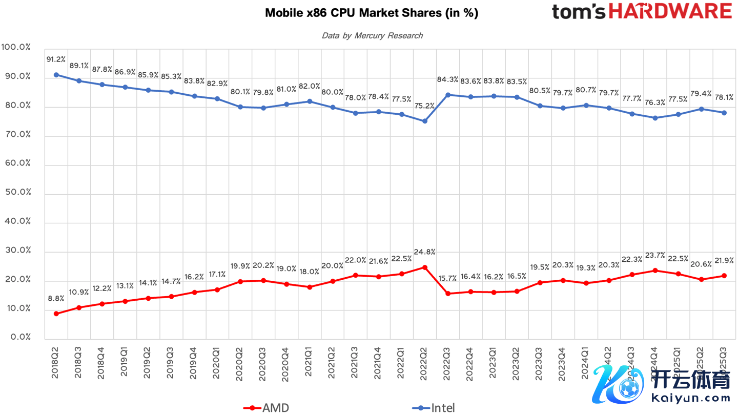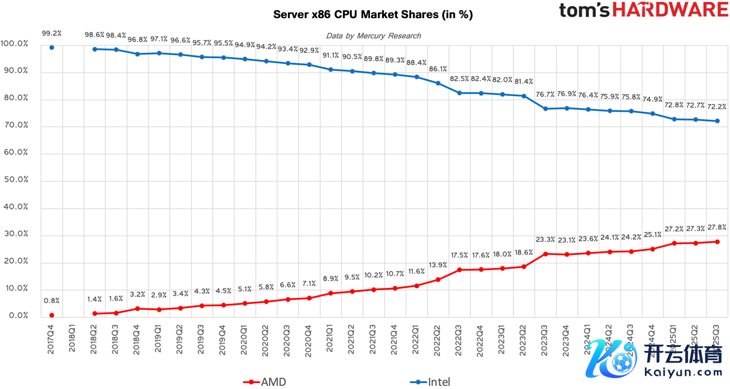 IT之家 11 月 15 日音书,凭证市集商议机构 Mercury Research 的最新数据,AMD 在 2025 年第 3 季度不时扩大其在 x86 管理器市集的份额,并创下两项迫切里程碑,执续挑战的开首地位。