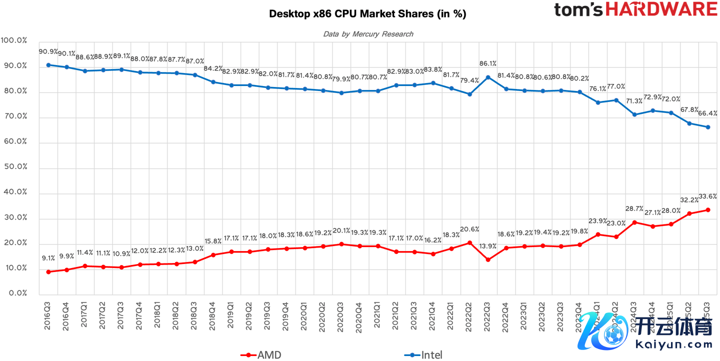 在台式机 CPU 市集,收货于锐龙 9000 系列“Granite Ridge”管理器在高性能和发热友级别市集广受宽饶,AMD 的市集份额好意思满了环比和同比双重增长,从客岁同期的 28.4% 大幅擢升至 33.6%。