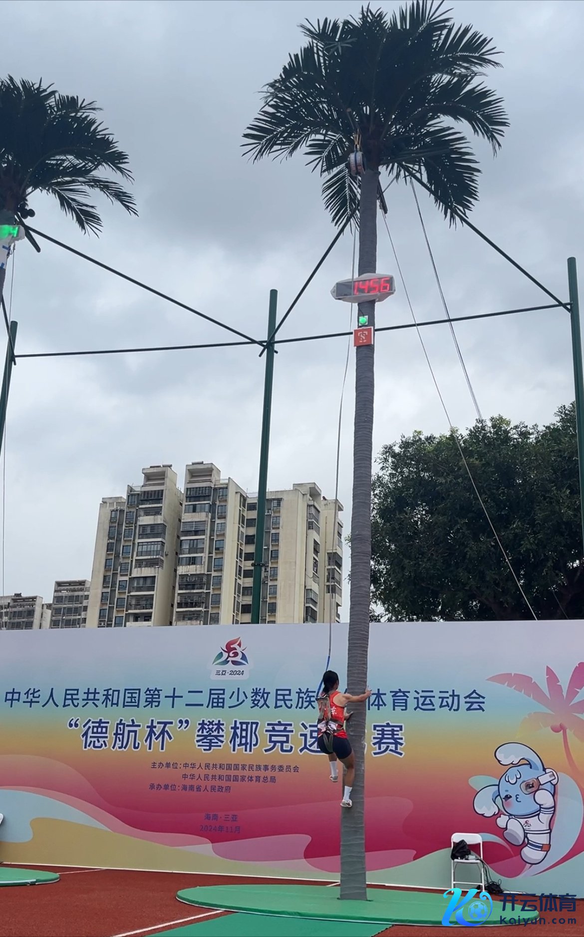 一个箭步冲刺到椰子树下,轻快一跃,双手和双脚牢牢扒住树干,腿脚发力朝上攀爬……一连串游刃过剩的行动后,第十二届世界少数民族传统体育通顺会广东代表团攀椰竞速神气队长龙土权“蹭蹭蹭”几秒钟就到达9米的高度,快速触碰计时按铃。