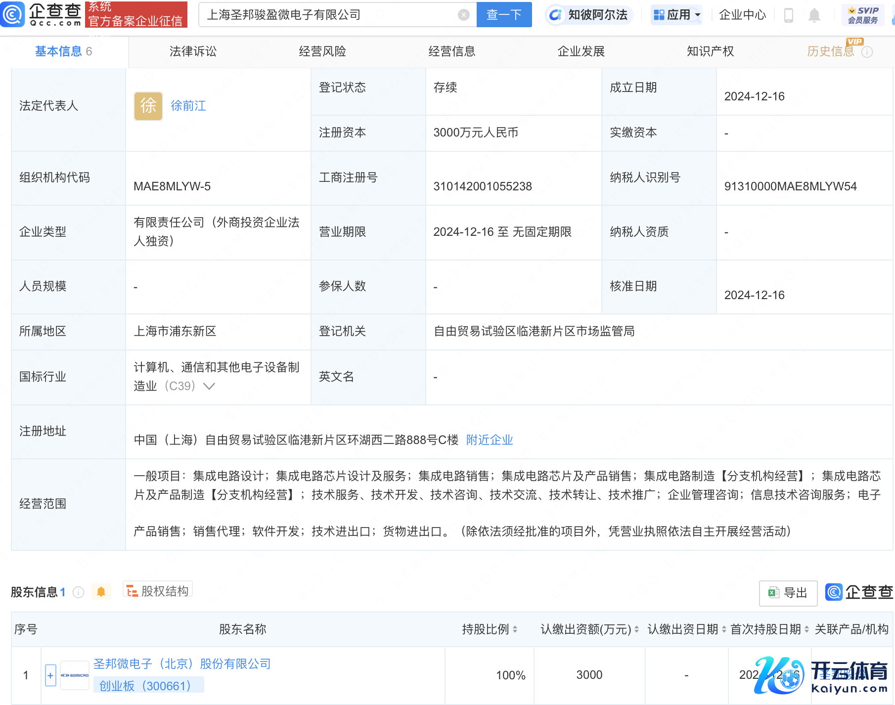 企查查APP走漏,近日,上海圣邦骏盈微电子有限公司建树,法定代表东谈主为徐前江,注册成本3000万元东谈主民币,宗旨鸿沟包含:集成电路运筹帷幄;集成电路芯片运筹帷幄及处事;集成电路销售;集成电路芯片及产物销售等。企查查股权穿透走漏,该公司由圣邦股份(300661)全资合手股。