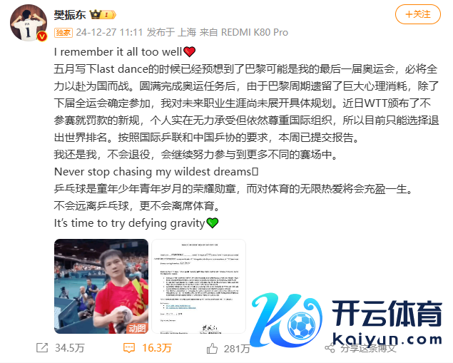 2024年,樊振东年终全国排活动第6位,获取巴黎奥运会男单及男团冠军,另外还获取了釜山世乒赛团体赛冠军、WTT重庆冠军赛男单冠军以及WTT新加坡大满贯男双亚军。12月27日,樊振东发文,称将退出全国排行,但不会退役。“我仍是我,不会退役,会不绝用功参与到更多不同的赛场中。乒乓球是童少小年轻年齿月的荣耀勋章,而对体育的无尽爱好将会充盈一世。不会隔离乒乓球,更不会离席体育。”
