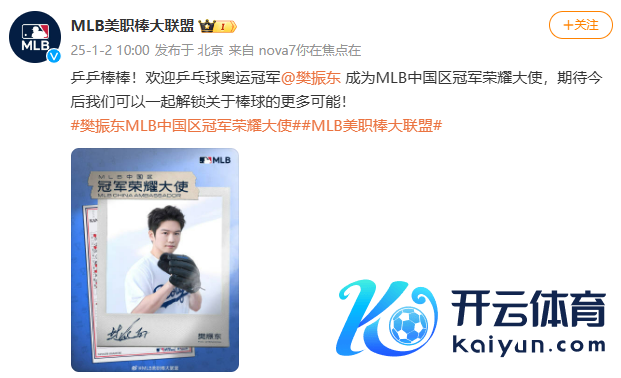1月2日云开体育,@MLB好意思职棒大定约 发文:迎接乒乓球奥运冠军樊振东成为MLB中国区冠军荣耀大使。