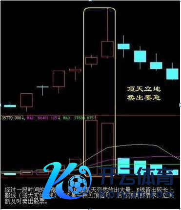 股价经过一段涨升后,若是某天出现了长上影线图线(或长实体图线),同期放出了大成交量,这种形式组合,就称为“顶天有时”。长上影图线(或长实体图线),像一柄长箭,直插天外,知道顶天之势。成交量栏里的量柱线,像孙悟赤手中的“金箍棒”,立在地上,两者连起来看,就组成了“顶天有时”形式。