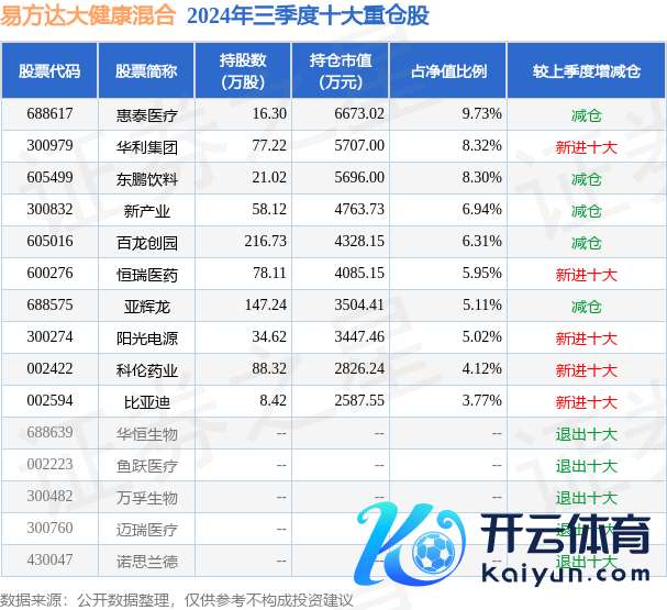 易方达大健康搀杂为搀杂型-活泼基金,凭证最新一期基金季报清楚,该基金财富竖立:股票占净值比85.44%,债券占净值比0.09%,现款占净值比28.85%。基金十大重仓股如下: