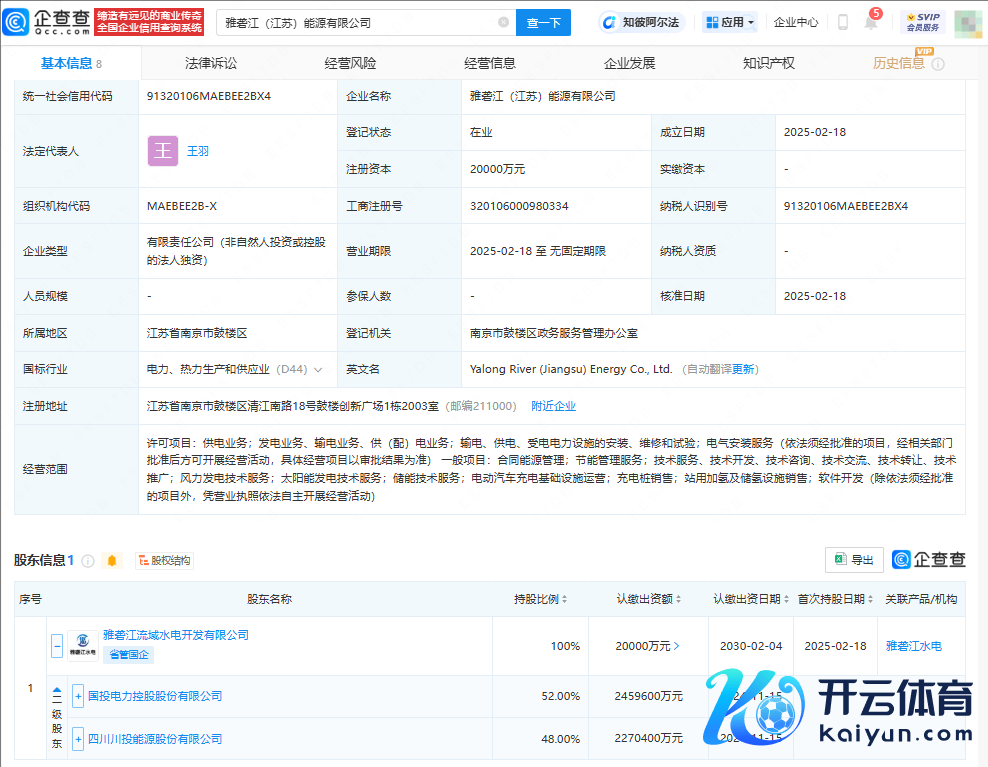 企查查APP显现开yun体育网,2月18日,雅砻江(江苏)动力有限公司耕种,法定代表东谈主为王羽,注册本钱2亿元东谈主民币,想象边界波及储能本事职业、电动汽车充电基础步调运营、充电桩销售、站用加氢及储氢步调销售等。企查查股权穿透显现,该公司由国投电力(600886)、川投动力(600674)曲折共同抓股。
